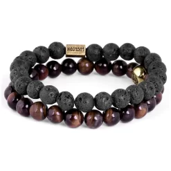 Red Tiger’s Eye & Black Lava Rock & Leather Cord Bracelet Set