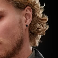 This simple stud earring for men is crafted from strong tarnish-free stainless steel and closes securely with a push back.
