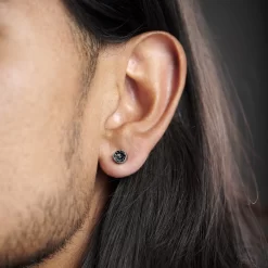 A bevy of black crystals festoon this circular earring. Fastens to your earlobe thanks to a strong built-in magnet. Price includes a single men’s earring only. Made with hypoallergenic steel.