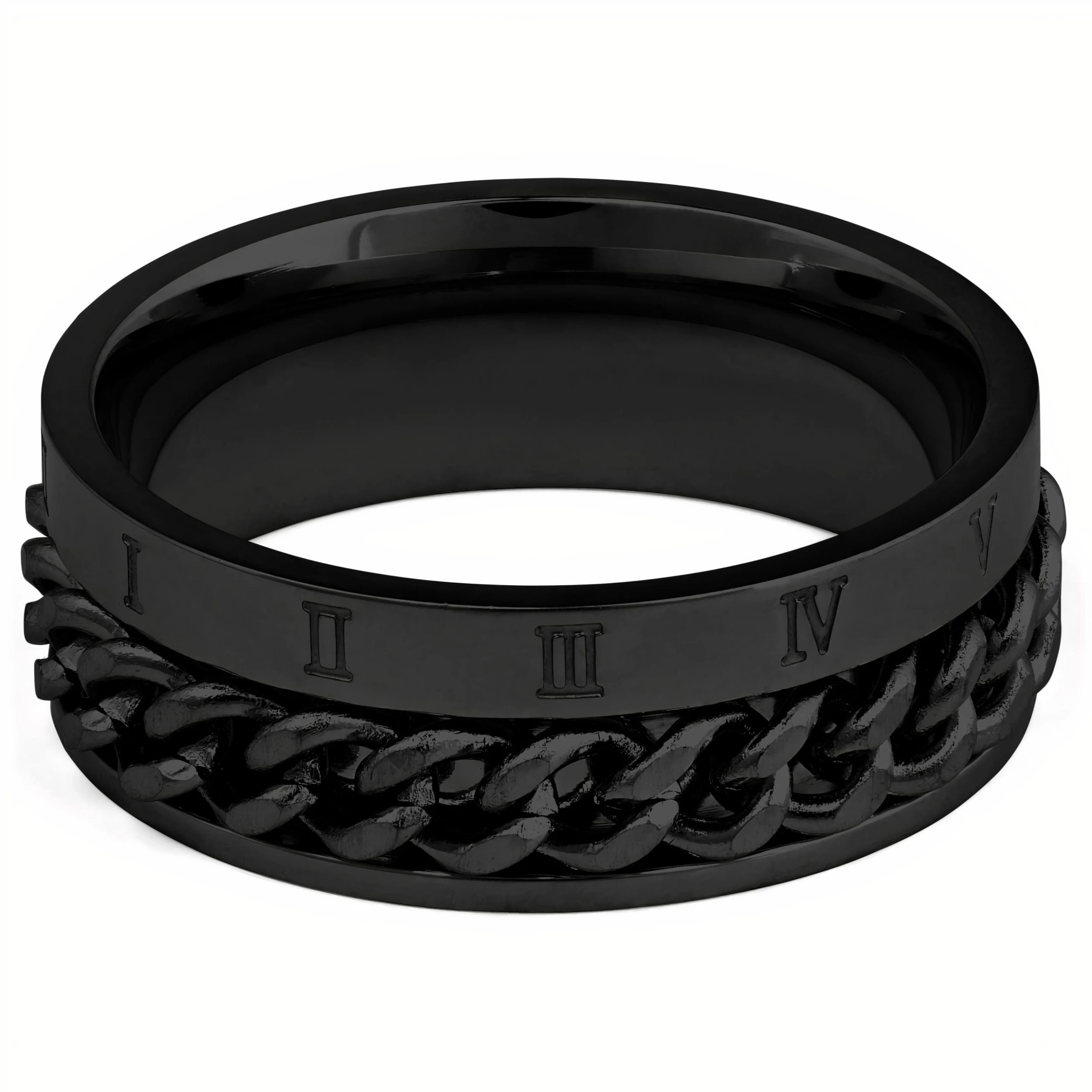 8 Mm Black Stainless Steel With Chunky Chain & Roman Numerals Ring