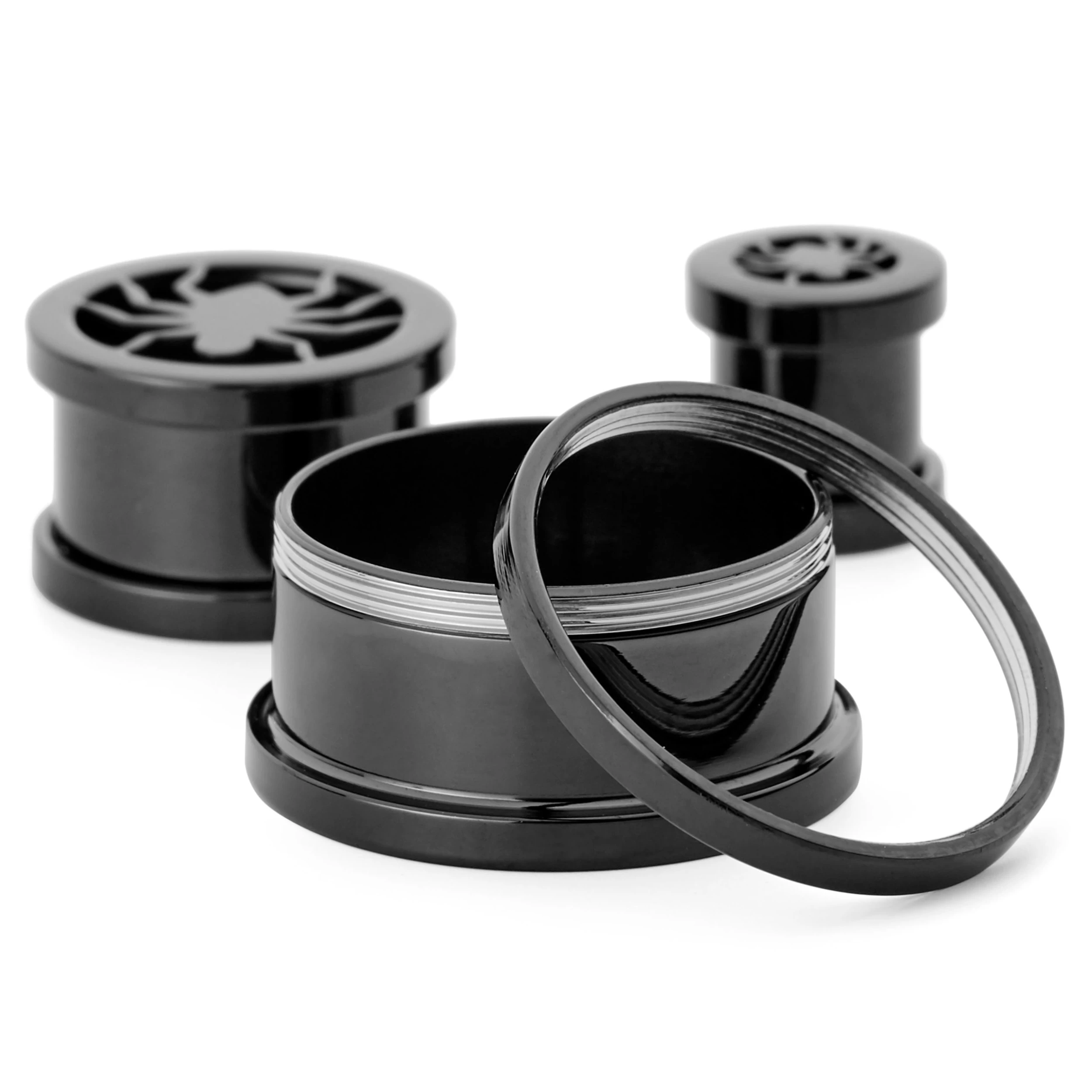 What a tangled web we weave. This double flare tunnel is constructed with polished surgical steel in black with a laser-cut spider design on the front.