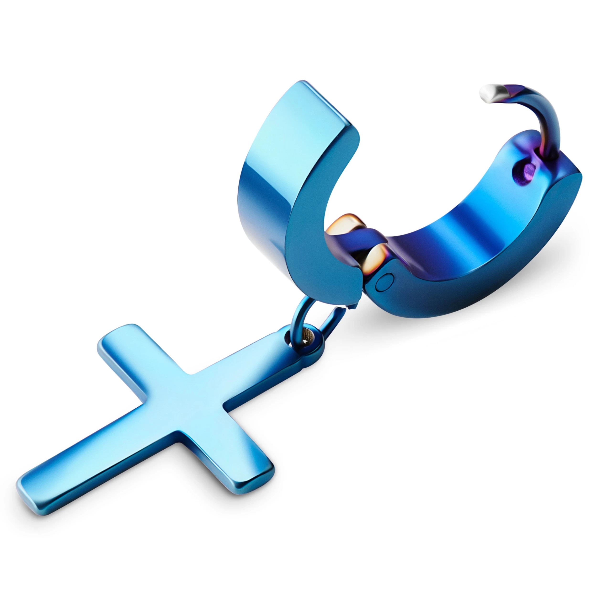 Where a unique character and a desire to display faith meet, you’ll find this metallic blue hoop earring and its accompanying lightweight cross.