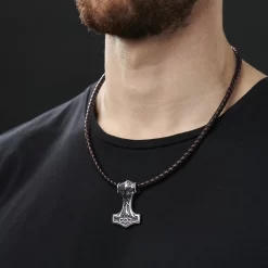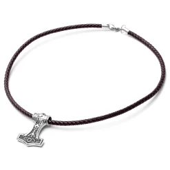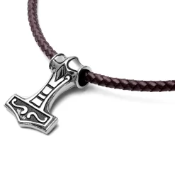 Brown Leather With Silver-Tone Stainless Steel Viking Hammer Necklace