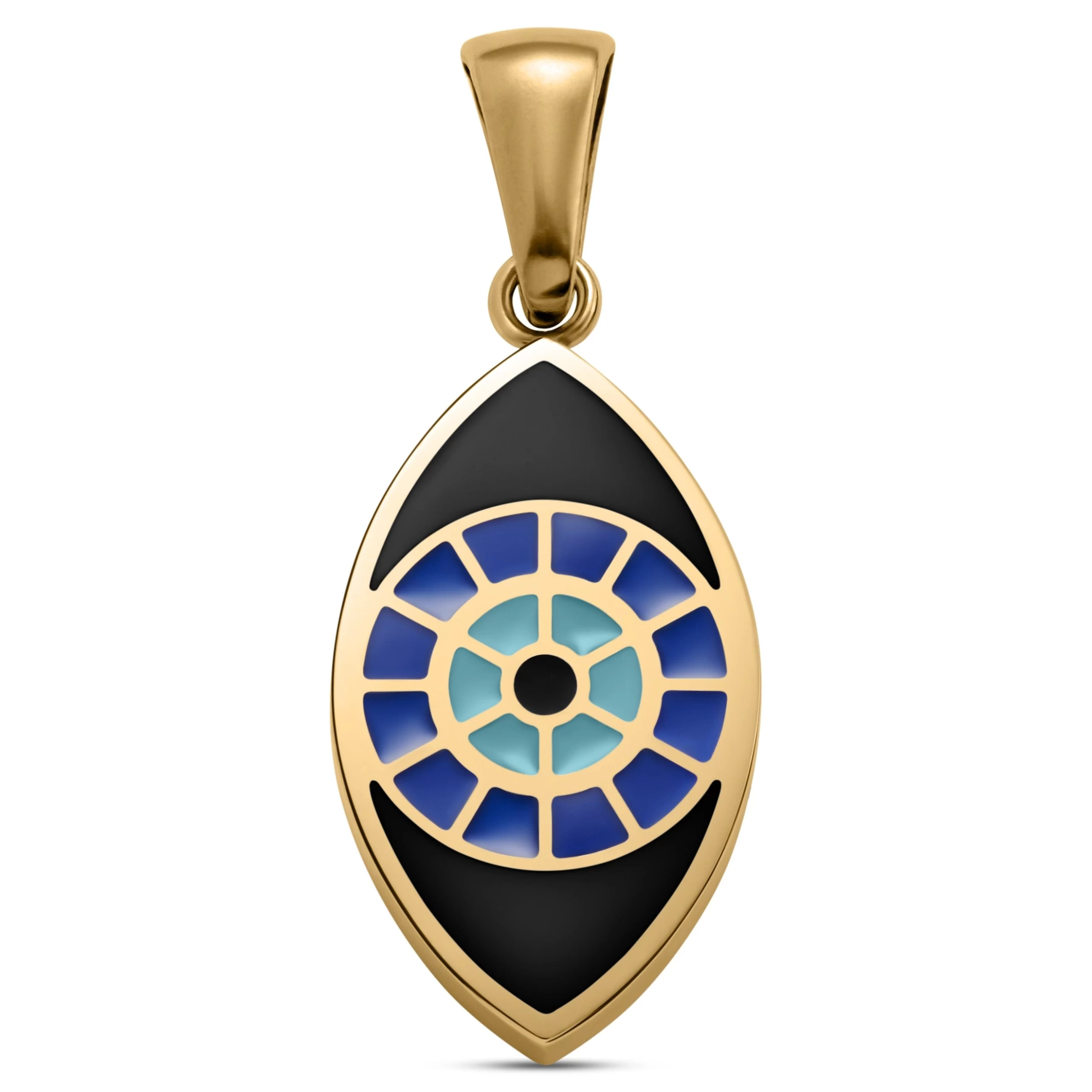 This men’s necklace pendant comes with the evil eye motif, an ancient symbol associated with protection against bad luck. The striking blue concentric design of the eye takes the foreground of this piece, forming a handsome contrast to the polished gold-tone finish.