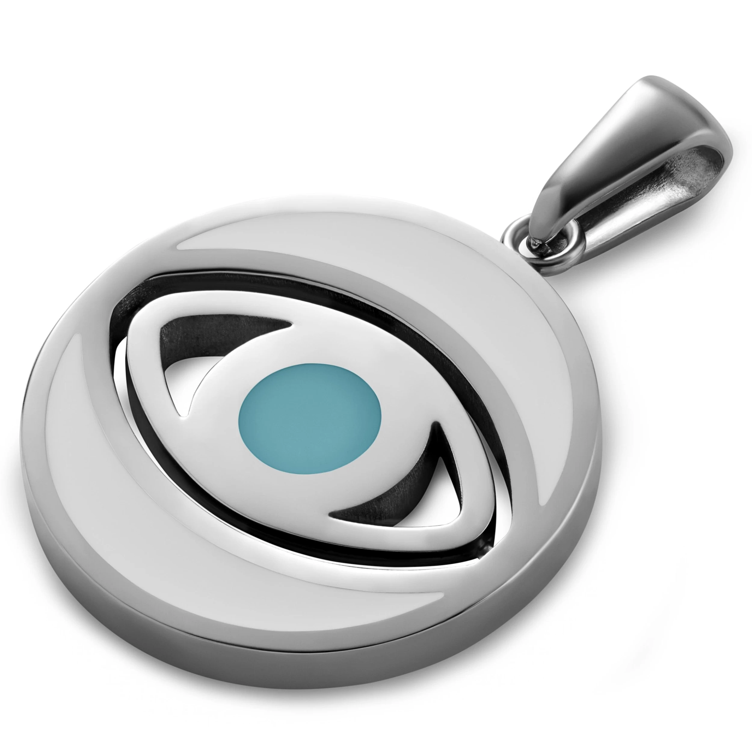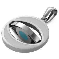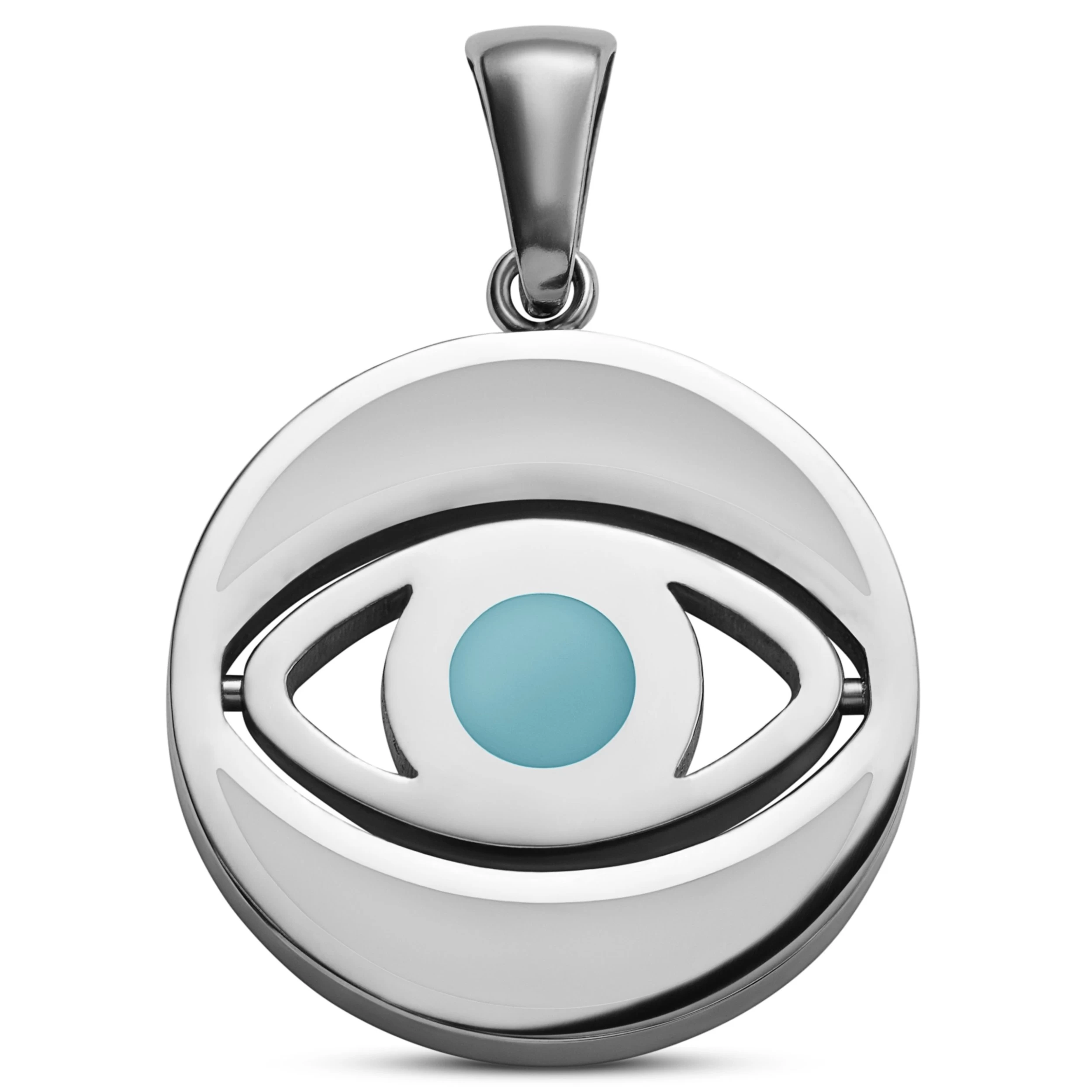 This flat and circular pendant features the design on both sides. Comes with an eye-shaped centre that rotates. With each spin, you’ll see the vibrant baby blue of the iris standing out against the silver-tone backdrop. Colored using tarnish-resistant enamel that won’t fade over time, making this a durable addition to your collection.