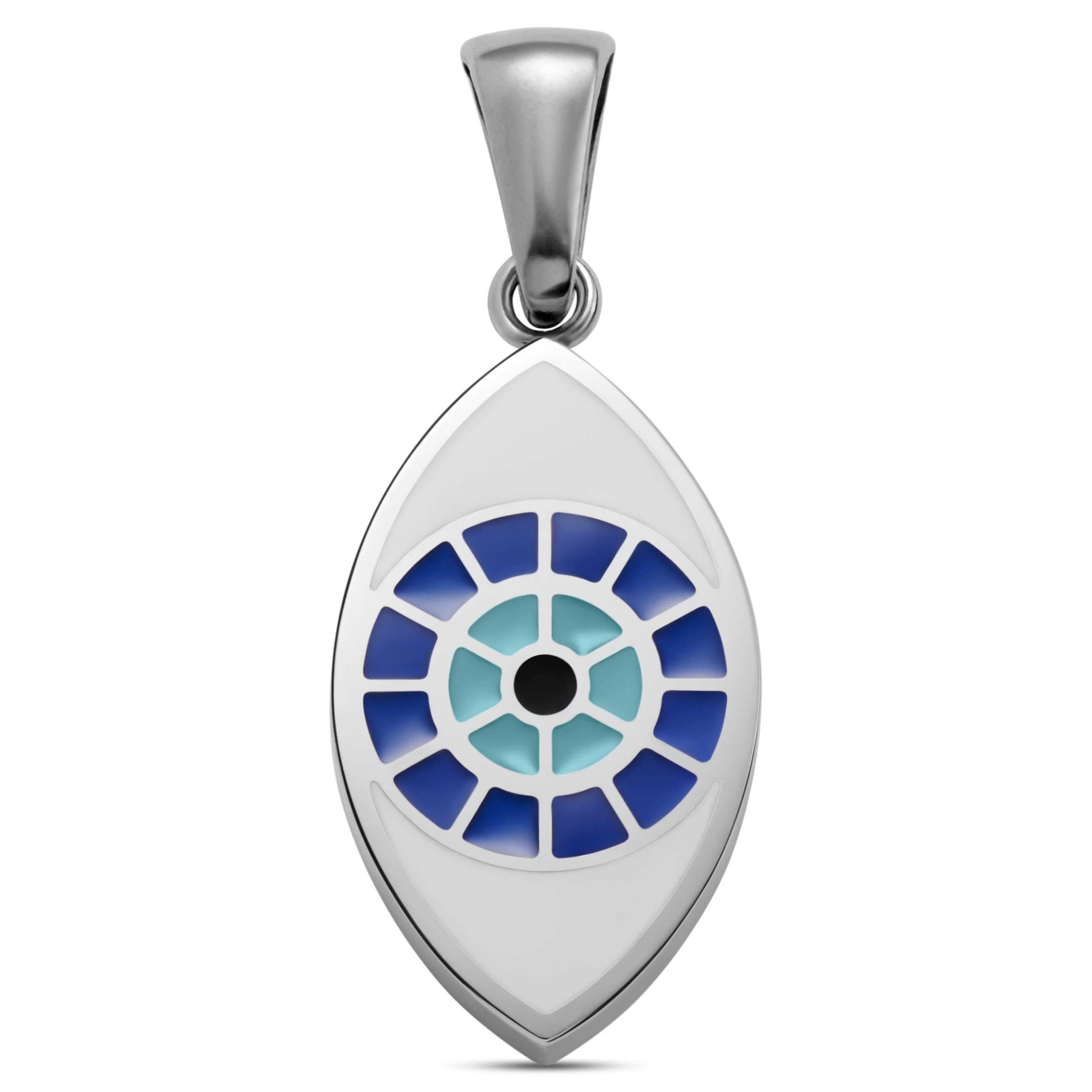This silver-tone men’s necklace pendant comes in a unique shape featuring the iconic evil eye motif. A symbol that spans across traditions and is believed to be a protective charm against bad luck and injury.