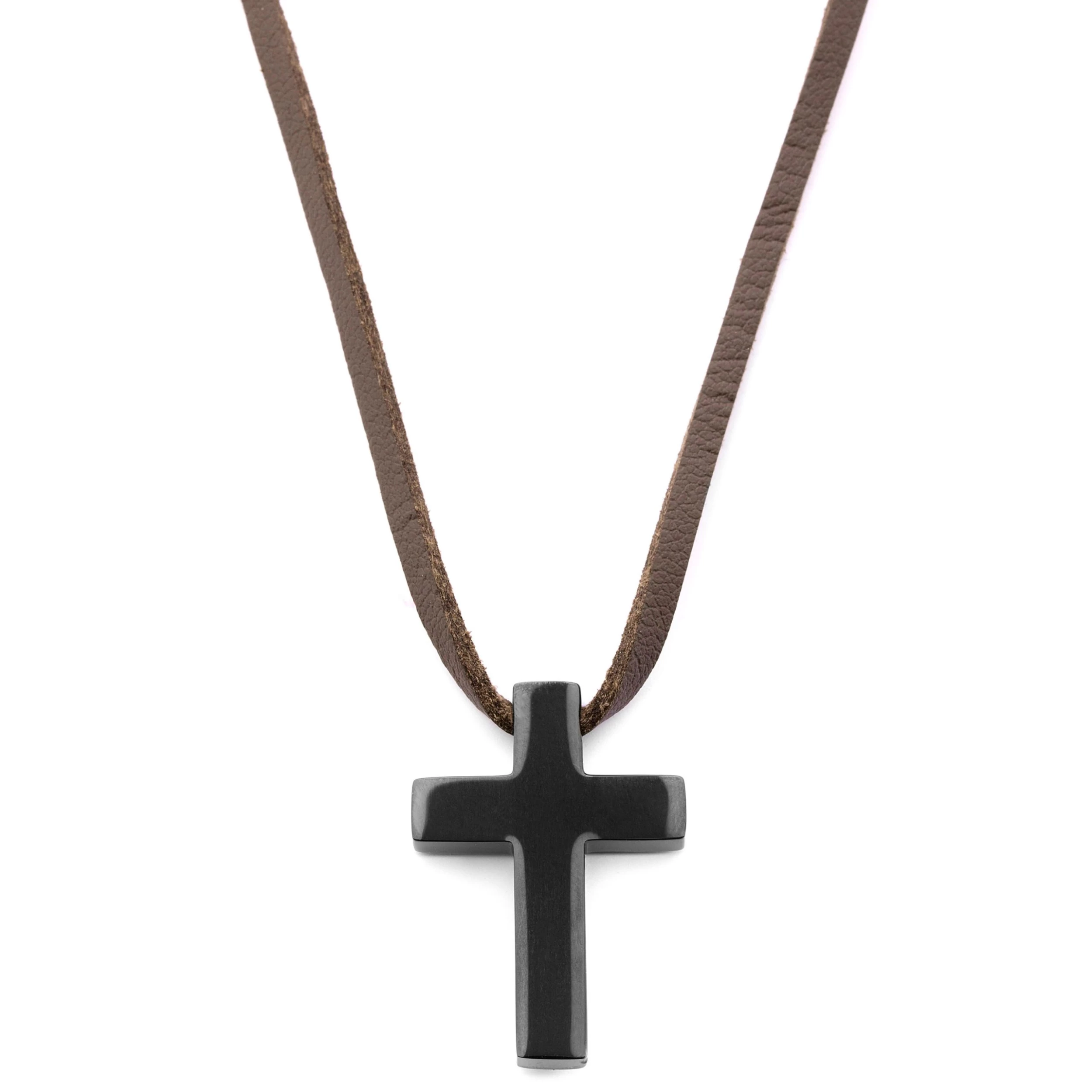 Iconic | Brown Leather With Black Stainless Steel Cross Necklace