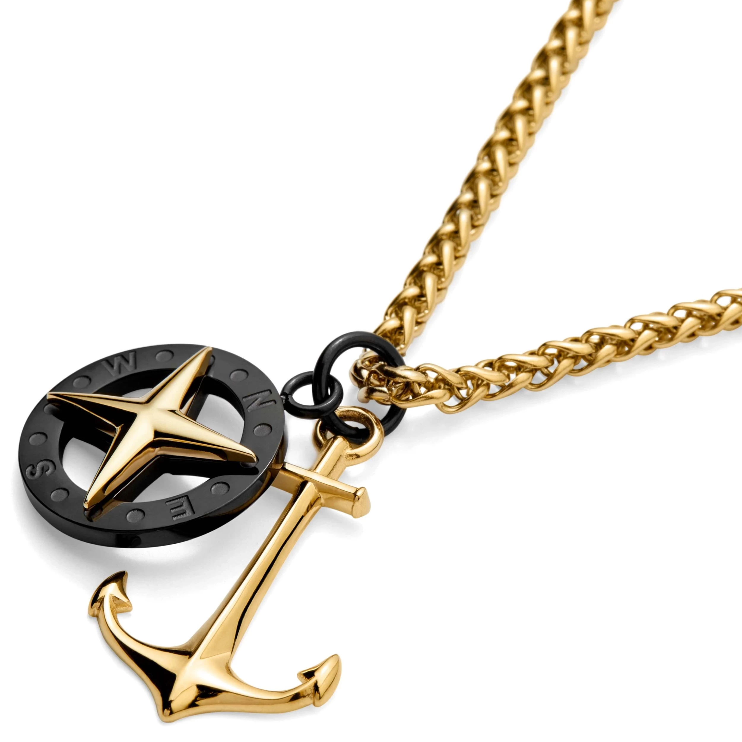 Tadd | Gold-Tone Anchor With Black Stainless Steel & Gold-Tone Compass Wheat Chain Necklace