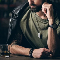 The perfect necklace length is subjective. The sketch is of a 6’2″, medium-build model with a 14 1/2” (37 cm) neck. For most men, a 19 3/4” (50 cm) necklace is standard. But men aren’t ‘standard’.